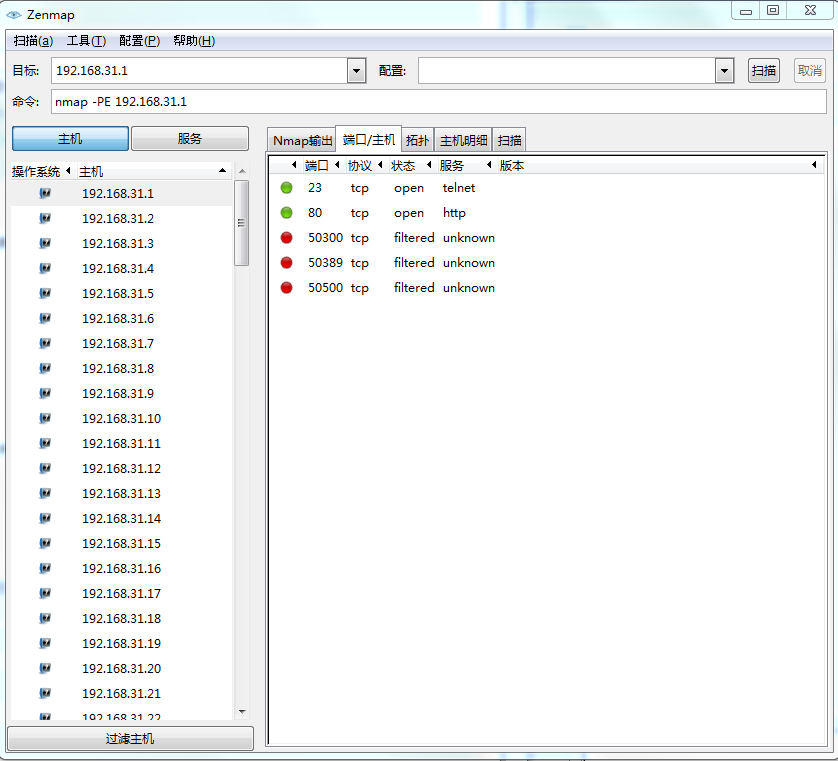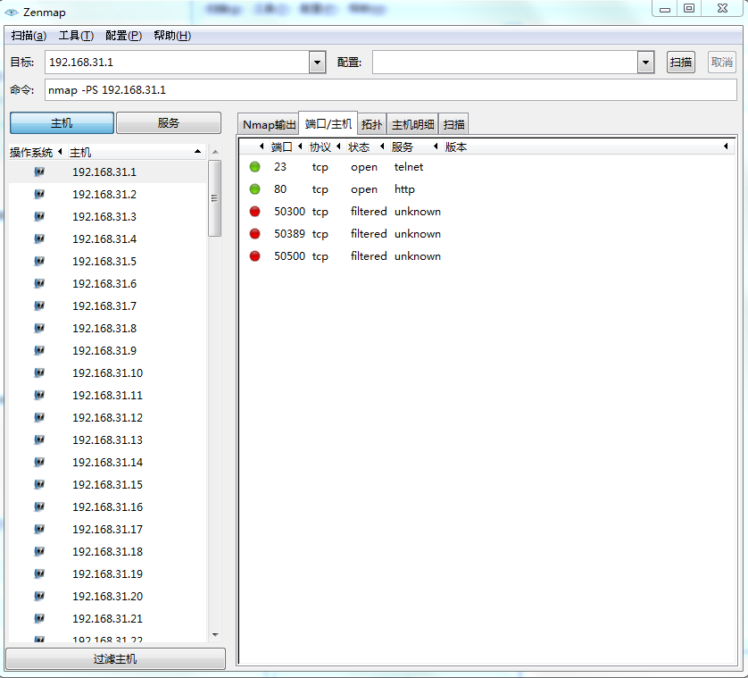 选择一个存活IP地址,扫描所开放的端口(分别用ping扫描,syn扫描尝试),并查询常用端口所对应的服务及操作系统信息。