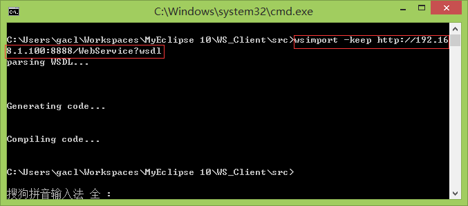 打开命令行窗口,切换到src目录,执行"wsimport -keep http://192.168.1.100:8888/WebService?wsdl"生成客户端代码,如下图所示: