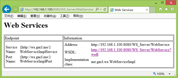 运行WebServicePublish类,就可以将编写好的WebService发布好了,WebService的访问URL是:http://192.168.1.100:8989/WS_Server/Webservice ,如下图所示: