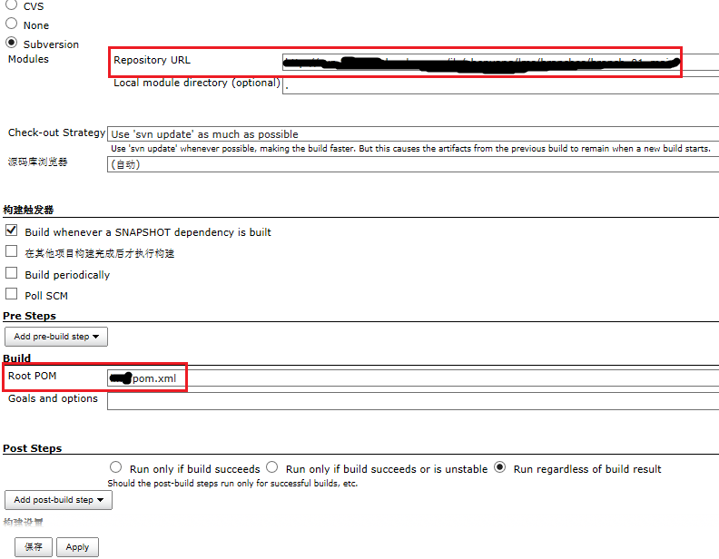 在Jenkins首页新建一个Job,类型为Maven构建。之后配置项目的SVN地址和Root pom.xml路径:
