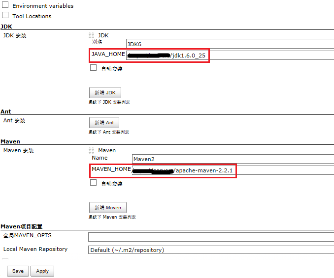 在全局配置中需要制定JDK和Maven的HOME目录: