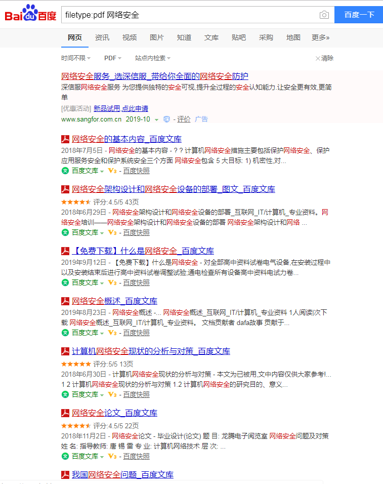 用百度或google搜索所有包含“网络安全”的pdf文档(附截图)