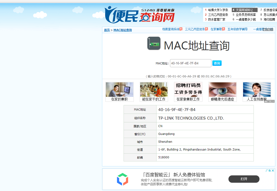 由便民查询网查询可知MAC地址:40-16-9F-4E-7F-B4对应厂商为TP-LINK TECHNOLOGIES CO.,LTD.