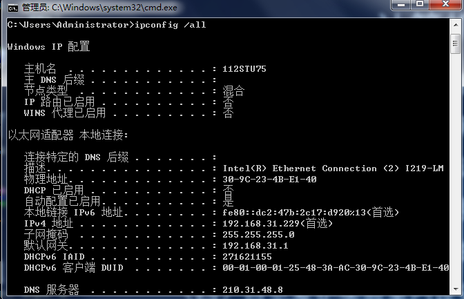 在cmd窗口中输入ipconfig/all即可得知本机IP地址为192.168.31.229,子网掩码为255.255.255.0