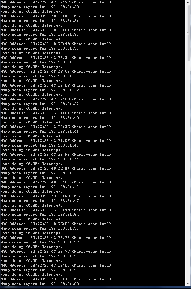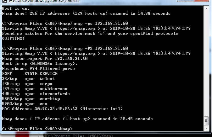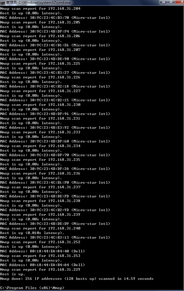 通过在comd窗口中调用nmap 执行nmap -sP 192.168.31.299/24扫描本网段存活主机,由结果可知有128台主机存活
