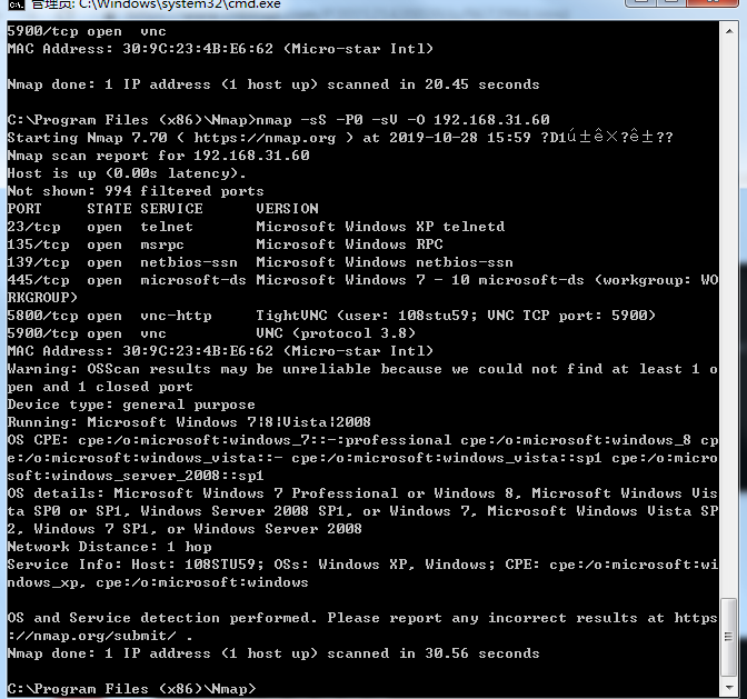 使用nmap -sS -P0 -sV -O 192.168.31.60进行syn扫描并探测远程系统类型和常用服务端口得到如下结果
