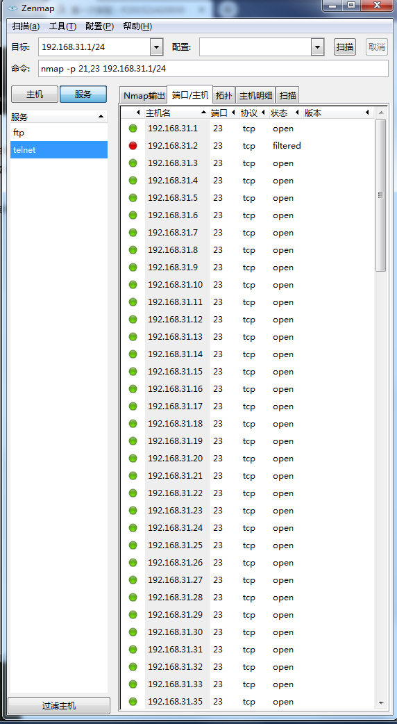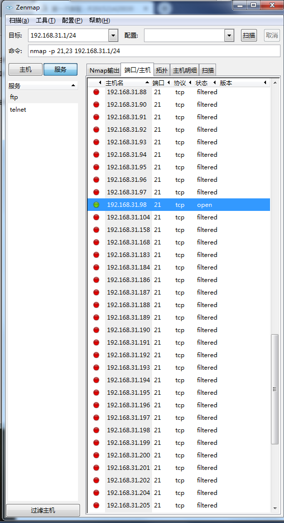 直接使用nmap软件并使用nmap -21,23 192.168.31.1/24命令查询可知192.168.31.98开启了ftp服务,并通过验证成功连接192.168.31.98的ftp服务