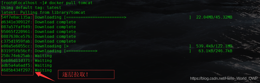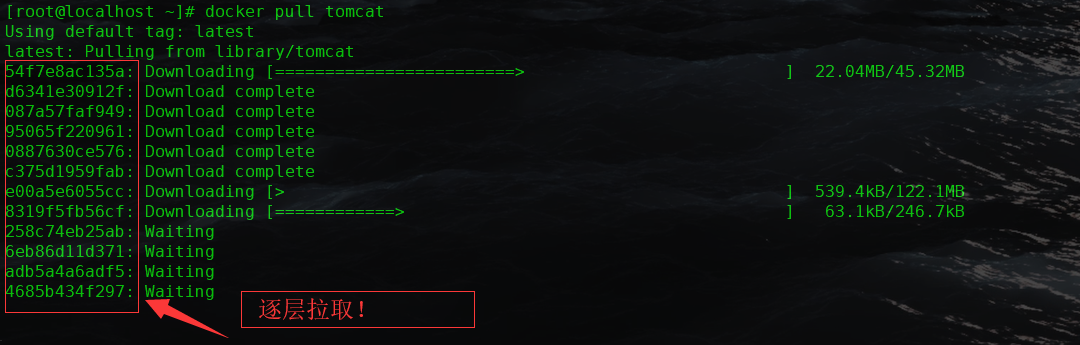 这儿以我们的 pull 为例,在下载的过程中我们可以看到 docker 的镜像好像是在一层一层的在下载,比如现在拉取一个 Tomcat 镜像文件,输入命令 “ docker pull centos ” ,会看到逐层下载,如下图: