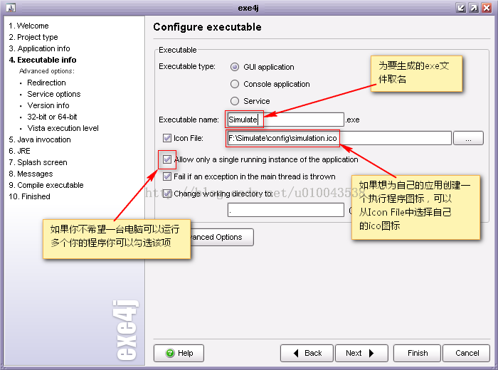 为我们要生成的exe取名,如果想生成自定义图标,那么选择你的ico文件,如果你不想在一台电脑上运行多个你的程序,你可以勾选“Allow only a single...”,点击“Next”