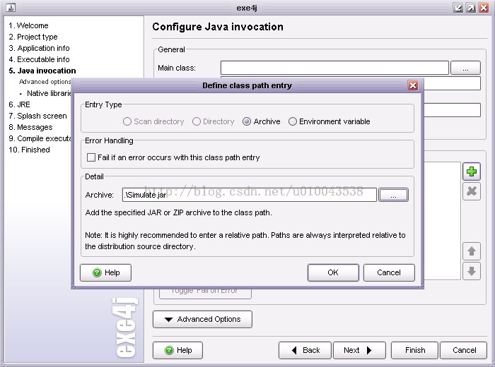 Main Class设置完成后,依次将所有需要的第三方类库加到Class Path下,方法同添加“Simulate.jar”一样,点击“Next”