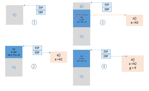 1) 一个普通函数f,ESP(寄存器中的栈位置)和EBP(寄存器中的栈基址位置)都指向当前栈对应位置