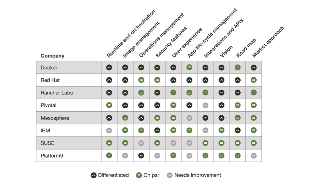 Forester依照上述10个标准,对八大最重要的企业容器平台提供商进行了逐项评级,等级共分为三类,向上箭头意味着“表现优异”,水平等号意味着“符合标准”,向下箭头意味着“亟待改善”。