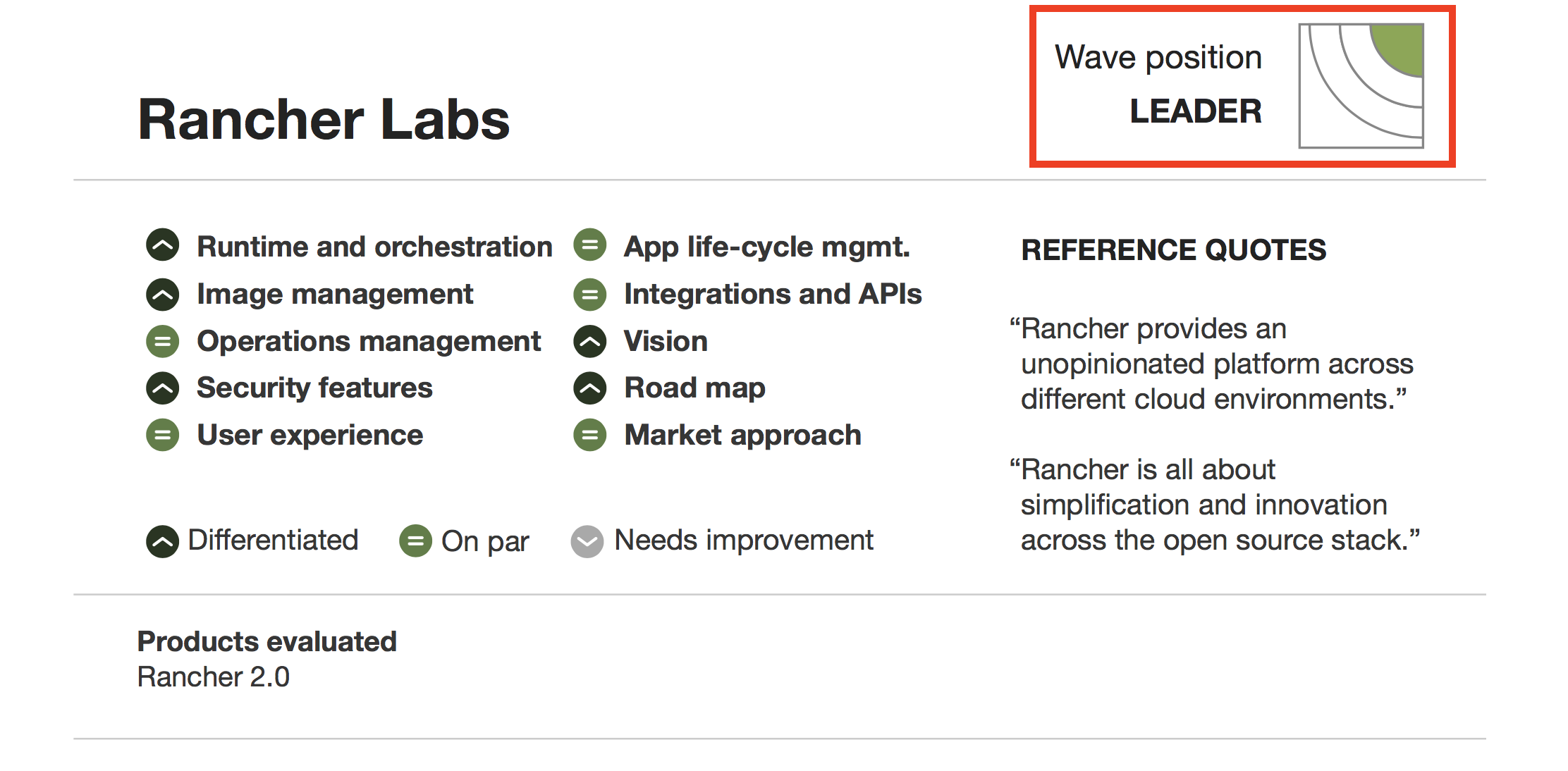 其中Rancher Labs在该十项中,运行时与编排、镜像管理、安全性、产品愿景、产品路线图5项表现尤其优异,运维操作、用户体验、应用程度生命周期管理、集成与API、市场方法5项亦均符合标准、位于业界平均水平线之上,也正因如此当之无愧地跻身Forrester New Wave企业级容器平台的“卓越领导者”一级。