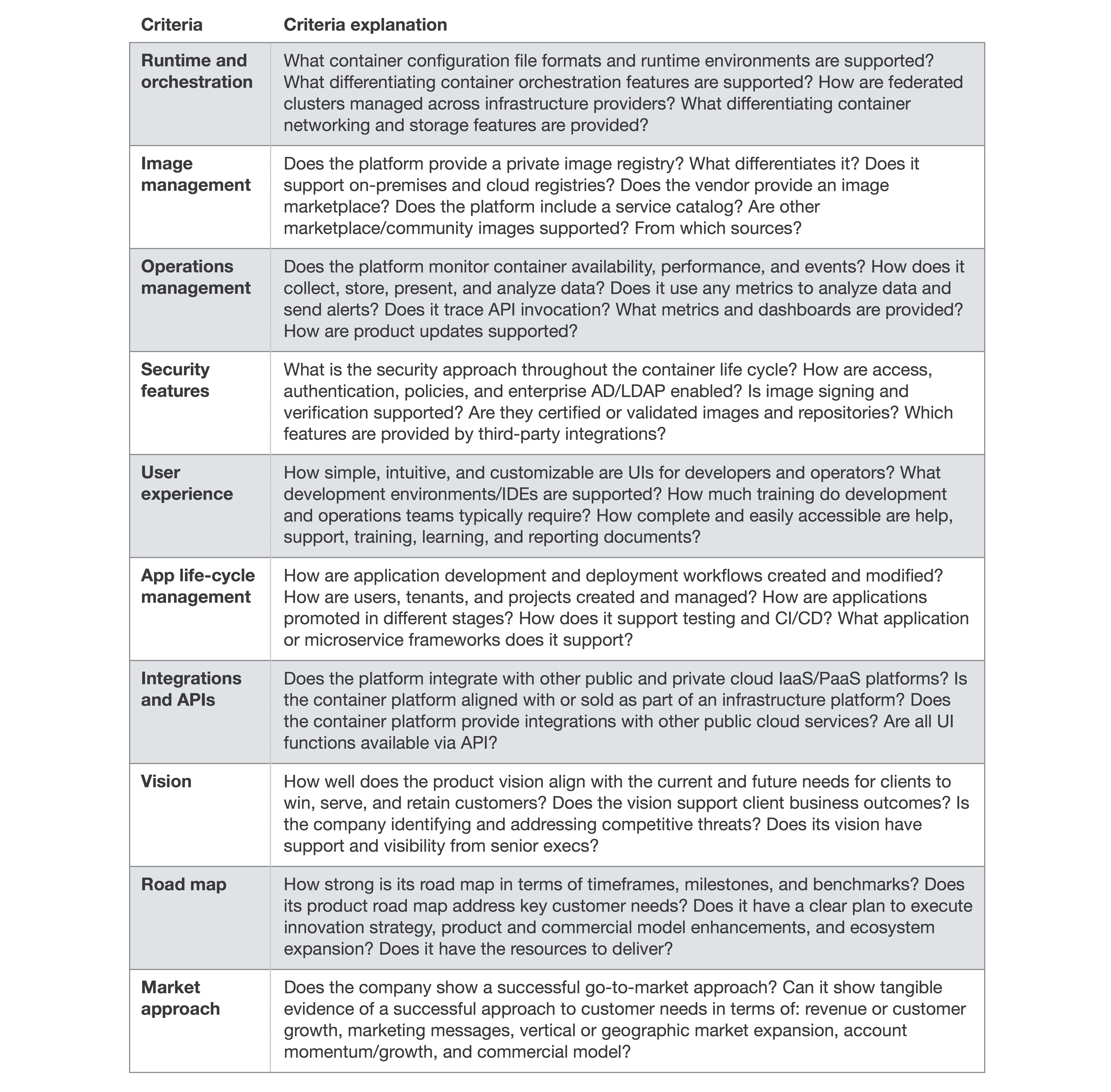 此次Forrester New Wave对企业级容器平台的调研与分析基于10个标准,分别为:运行时与编排、镜像管理、运维操作、安全性、用户体验、应用程度生命周期管理、集成与API、产品愿景、产品路线图、市场方法。