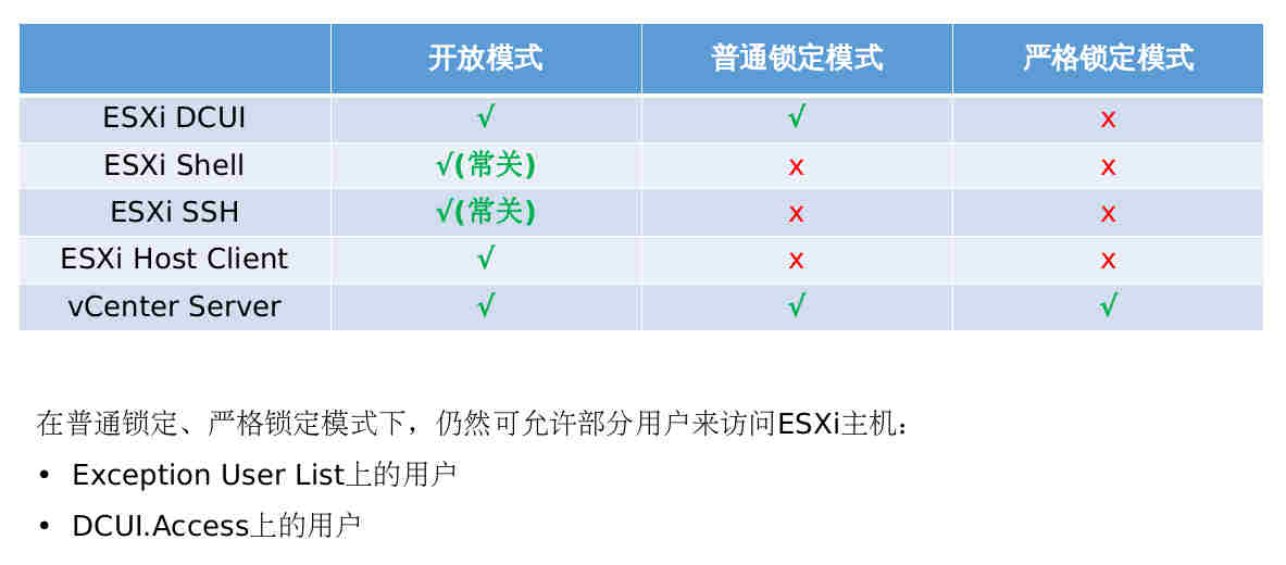 VMware vSphere ESXi主机的访问控制,除了强制要求使用https加密连接之外,还可以关闭DCUI通道,设置为Normal Lockdown(普通锁定)或Strict Lockdown。