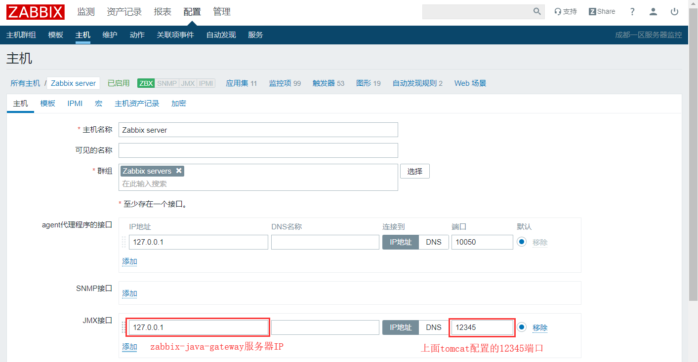 反过来看开头的那幅图,Zabbix-server通过JavaPollers进程调用zabbix-java-gateway获得tomcat数据,而zabbix-java-gateway就是通过这里配置的tomcat地址和端口,连接到tomcat从而获取到数据。