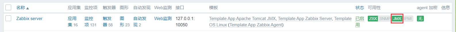 或者查看/var/log/zabbix/zabbix-server.log日志,出现enabling JMX agent checks on host “127.0.0.1”: host became available则表示能连接上。