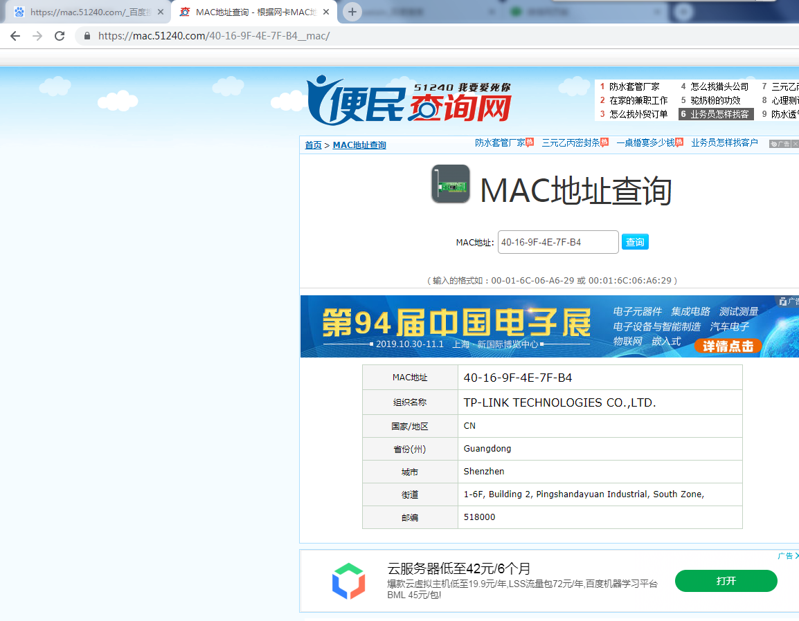 在一个案件中,获取了犯罪嫌疑人的一个MAC地址:40-16-9F-4E-7F-B4,请查询该MAC地址对应的厂商是(附截图)