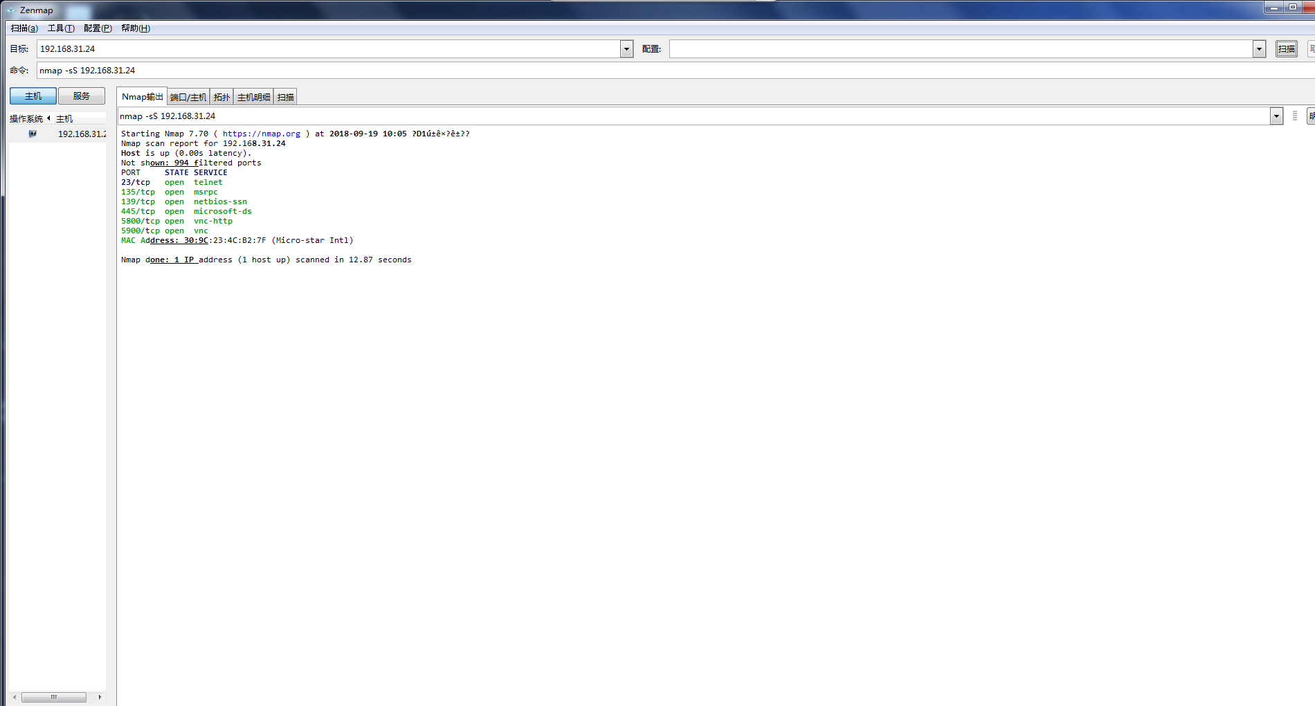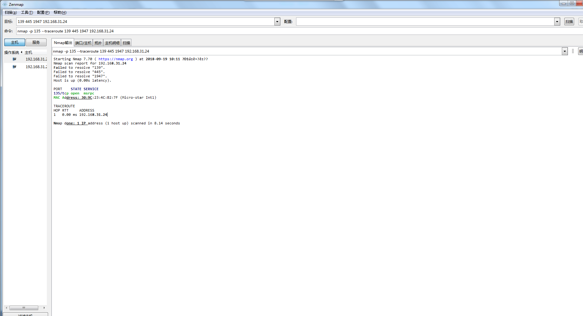 选择一个存活IP地址,扫描所开放的端口(分别用ping扫描,syn扫描尝试),并查询常用端口所对应的服务及操作系统信息。