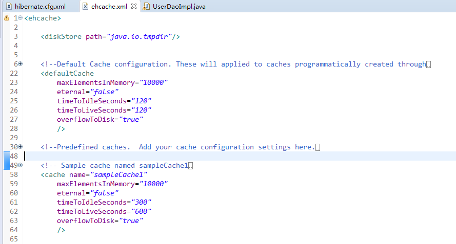 在hibernate文件夹下的project/etc目录下,有个ehcache.xml里面就有基本的ehcache配置了,我们可以直接将其拷贝到项目中使用。