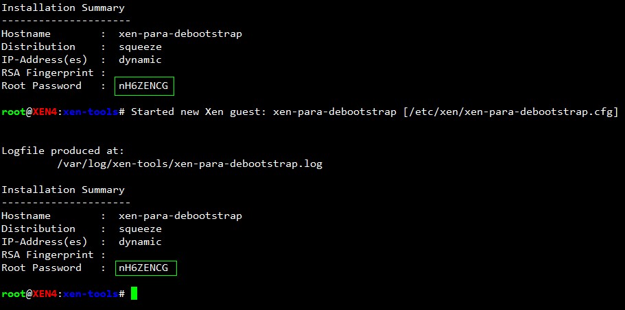 因为在配置文件中我定义的是自动分配root密码,通过dhcp获取ip,并且安装完成后自动启动,可以看到会随机分配一个root密码,并且在安装完后启动,但是并未显示通过dhcp获取的ip地址,在日志中也没有,这就需要我们通过xm console xen-para-debootstrap连接到虚拟机上查看,如下图: