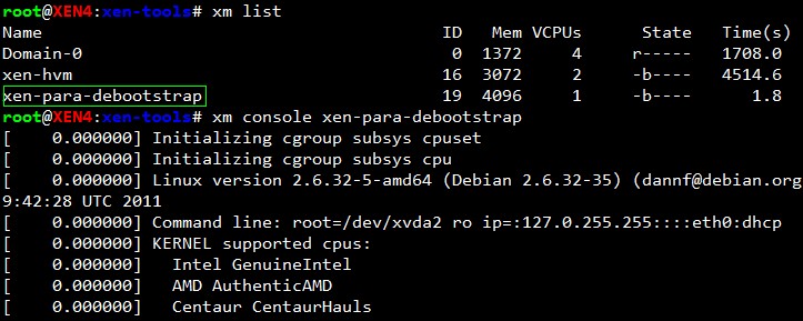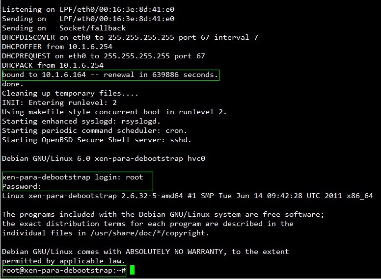 可以看到xen-para-debootstrap已经自动运行了,接下来利用console登录系统,会显示系统启动过程的信息,在这里面可以发现通过dhcp获取的ip地址,如图: