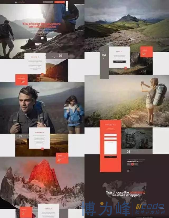 下面是一个旅游类的网页,中间用了大面积的方形元素,利用这些方形的大小和改变长宽比例来错列排版。