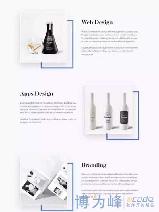 下面案例图片中设计师为了让多张图片进行统一协调起来,也加入了方框的元素。给用户传达了三块内容的体系关系。让原本简约而优雅的画面变得多姿多彩。