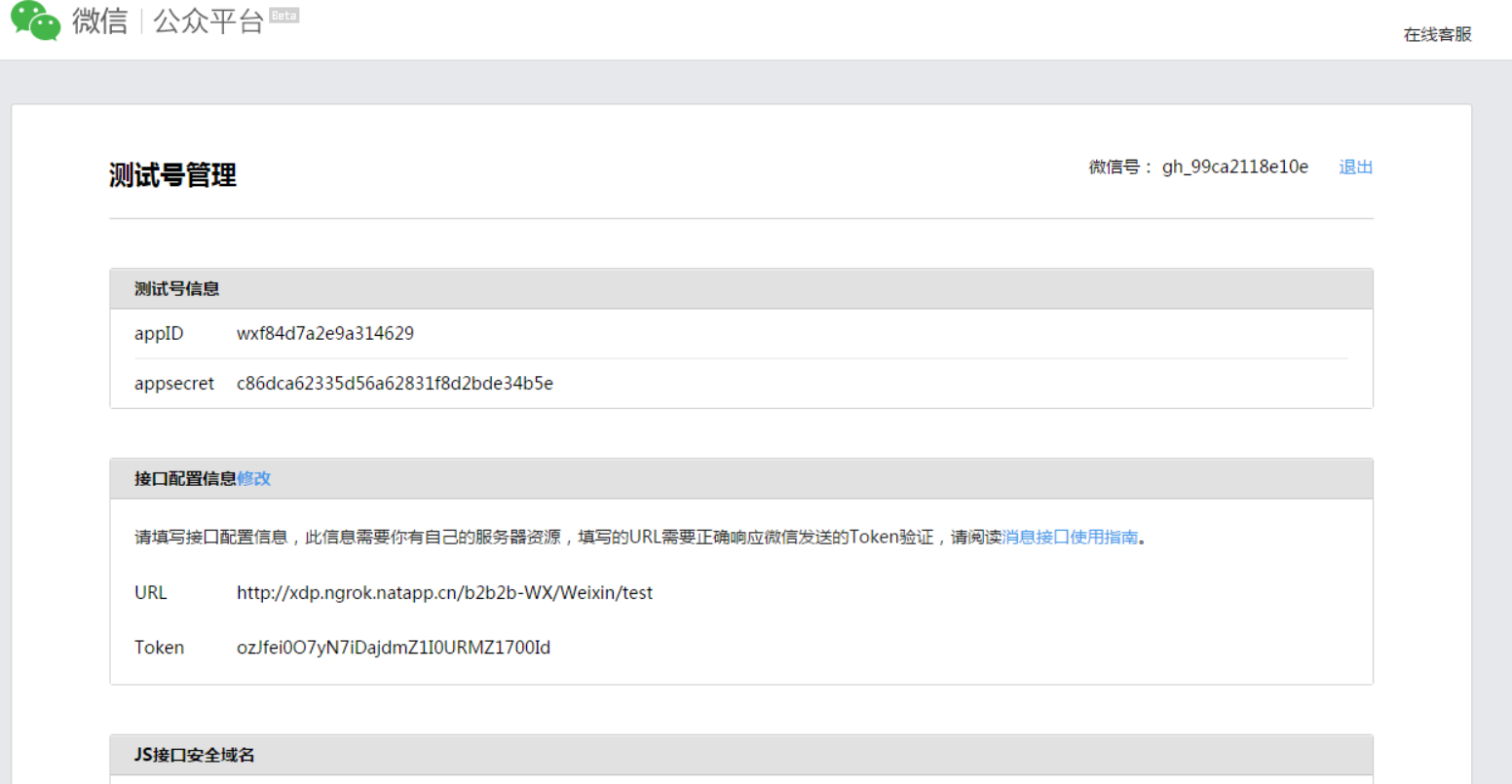 用微信扫描上述的二维码进行登录,登录成功后,就可以看到腾讯分配给我们的测试公众号的信息了,如下图所示: