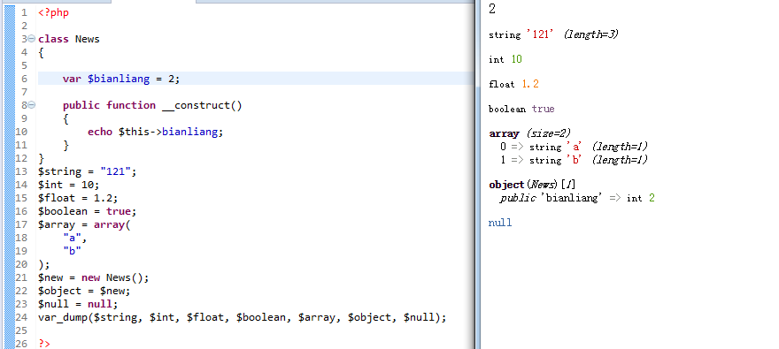字符串、整型、浮点型、布尔型、数组、对象、空值。