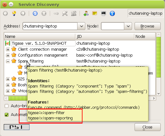 最后一个功能可能对于咱们的垃圾过滤组件用处不大,但是对于类似MUC/PubSub这种设置了正确类别和类型的服务发现条目项而言还是非常有用的。下面我们为垃圾过滤组件设置“自动”类别和“垃圾过滤”类型: