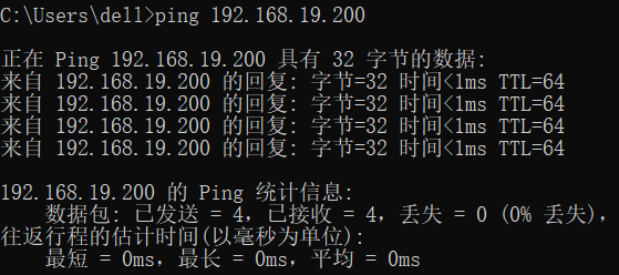 8、在Windows中使用cmd,ping 192.168.19.200的结果发现可以通信;