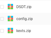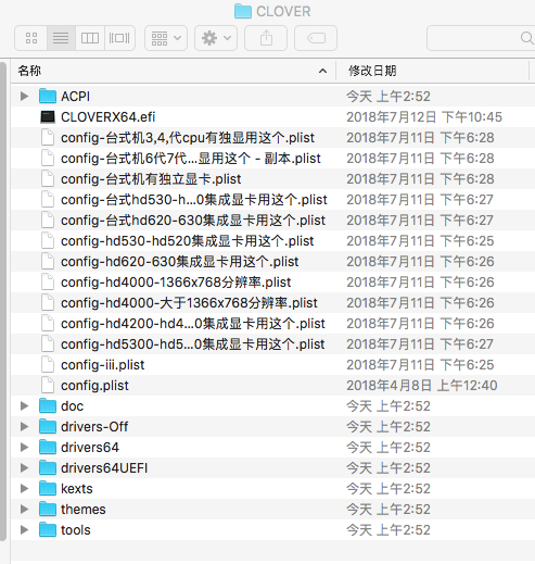 下载好这三个,分别解压出来,然后把原来优盘的EFI文件夹备份,把config.plist直接复制到clover的目录下,把kexts里边的东西复制到对应的文件夹里边,把DSDT文件复制到ACPI文件夹的patched里。