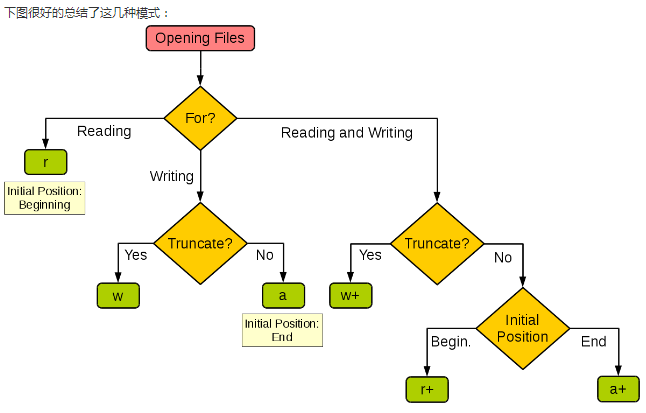 - 第二个参数描述文件如何使用的字符。 mode 可以是 'r' 如果文件只读, 'w' 只用于写 (如果存在同名文件则将被删除), 和 'a' 用于追加文件内容; 所写的任何数据都会被自动增加到末尾. 'r+' 同时用于读写。 mode 参数是可选的; 'r' 将是默认值。