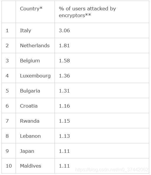 **百分比=本国被勒索软件攻击的用户数/本国所有卡巴斯基产品用户数x100%。