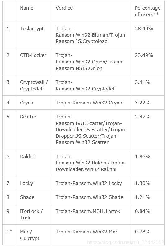 **百分比=被某种勒索木马家族攻击的用户数/所有被勒索软件家族攻击的用户数x100%