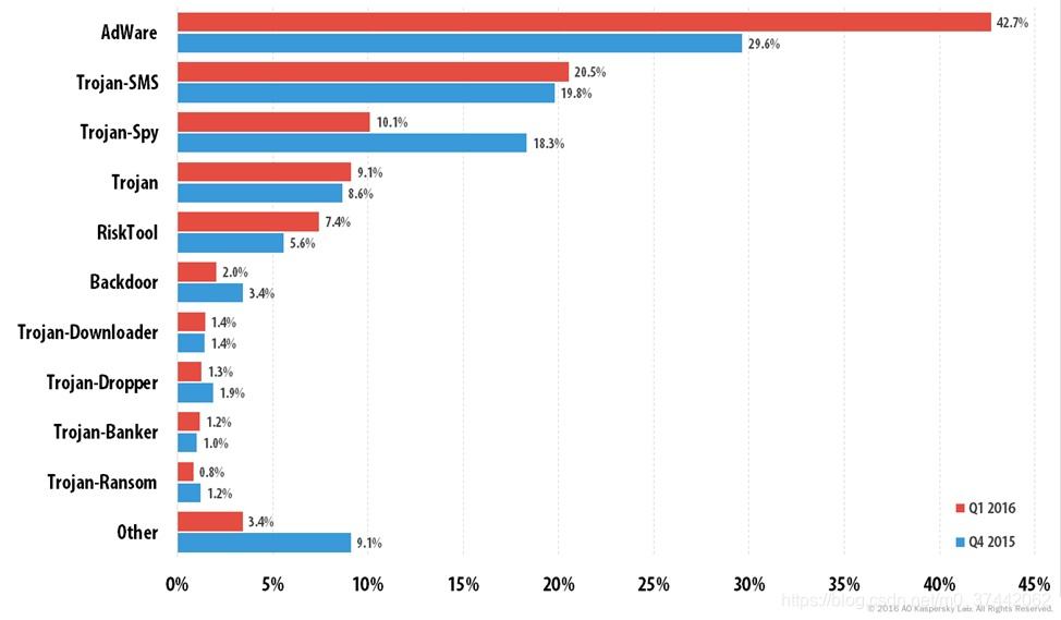在2016年第一季度,广告软件依然是在移动设备上检测最多的恶意程序。相比于2015年第四季度,广告软件的份额上升了13%,达到了42.7%。值得注意的是,这比2015年第三季度少(52.5%)。