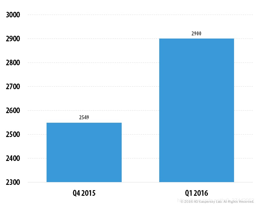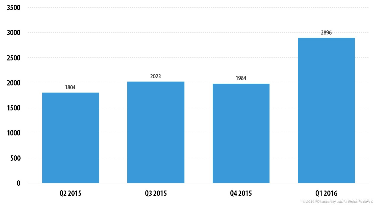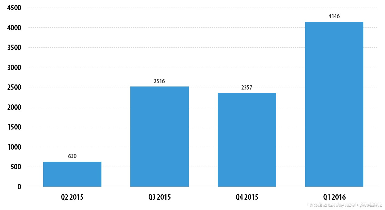 *基于卡巴斯基的数据,勒索软件变种的数量(2015第四季度和2016第一季度的对比)