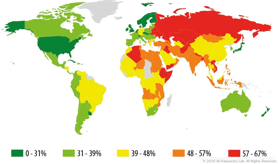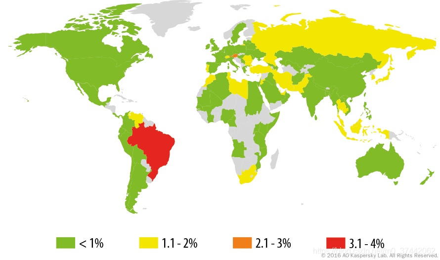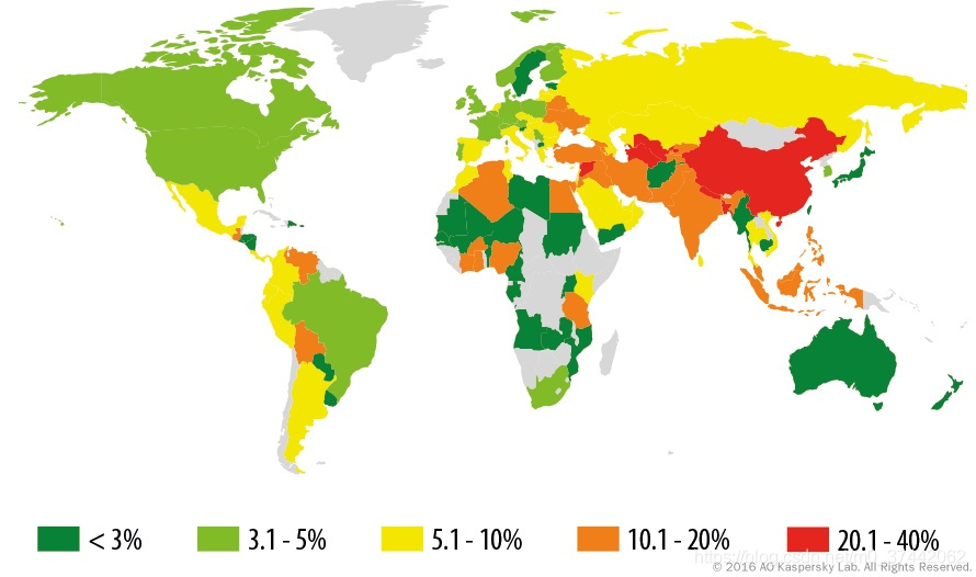 ***百分比=该国计算机上检测出本地威胁的用户的数量/该国所有卡巴斯基用户数x100%