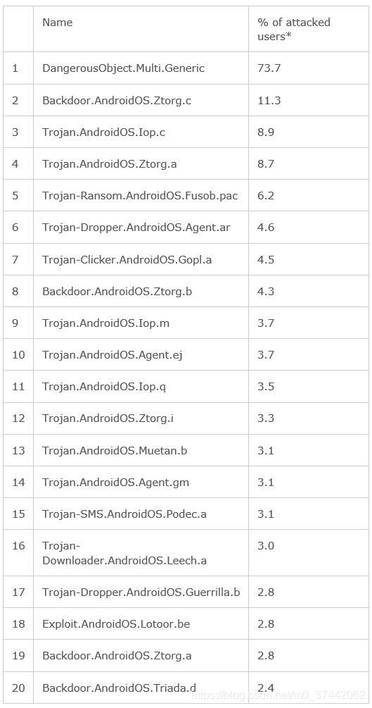 Backdoor.AndroidOS.Triada是新入Top20的,当用户在手机银行客户端网上支付时,该木马重定向银行发给用户的验证短信息。这些钱去了攻击者的钱包里,不是达到了用户的目的。Triada是我们知道的最复杂的手机恶意软件。它的最大特色是将其自身的恶意代码注入到Zygote进程里(注:这可理解为所有安卓程序的“父进程”,只要运行程序Zygote必须加载,一旦一个程序感染Triada,由于Zygote其他程序也要调用,所以会导致整体性的感染)。Triada只存在于内存里。此外,该木马的所有进程都隐藏了起来。