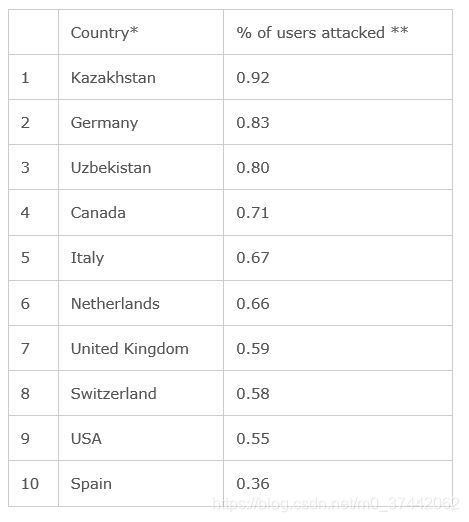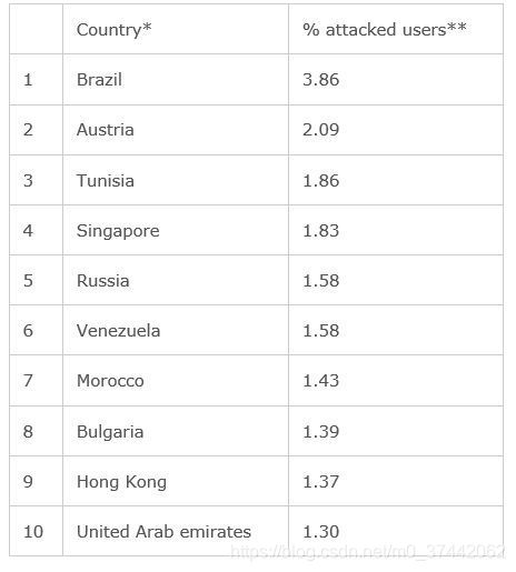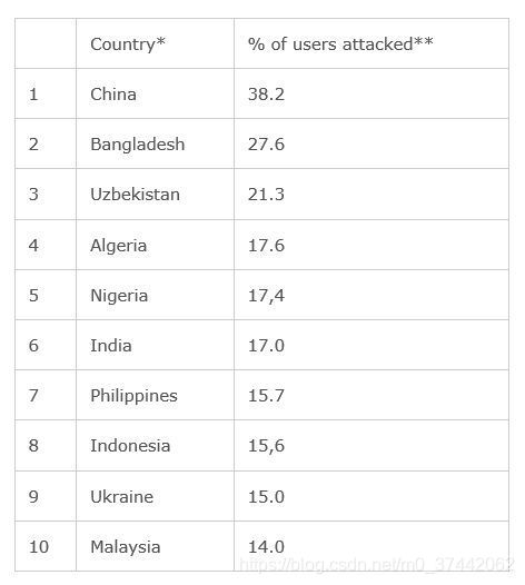 ***百分比=该国受到网络攻击的用户数/该国所有卡巴斯基用户数x100%