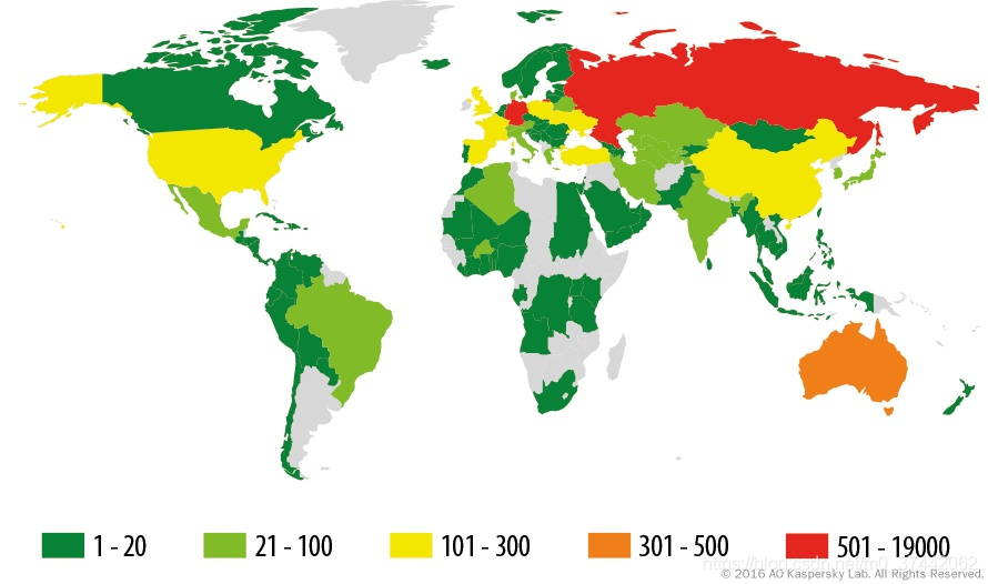 **我们忽略了卡巴斯基用户较少的国家(少于10,000)