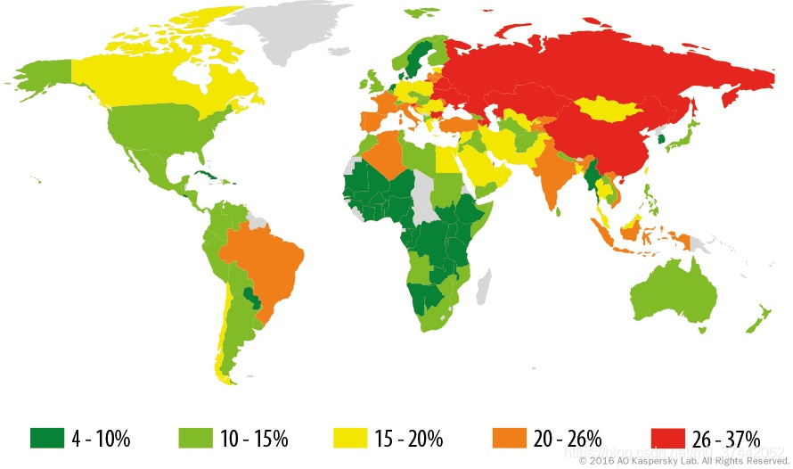 中国位居榜首,40%的用户至少在一年里有一次被攻击。在2015年,中国依然是位居榜首。