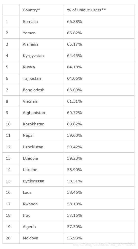 *在这个排名中我们忽略了卡巴斯基用户相对较少的国家(少于10,000)。