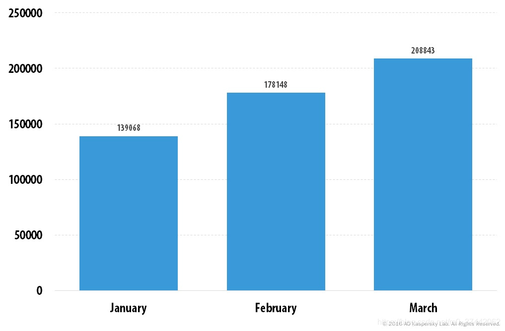 在2016年第一季度,卡巴斯基的网络反病毒模块检测到了18,610,281个恶意的文件,包括脚本,漏洞利用程序,可执行文件等。74,001,808个站点被判定为危险。