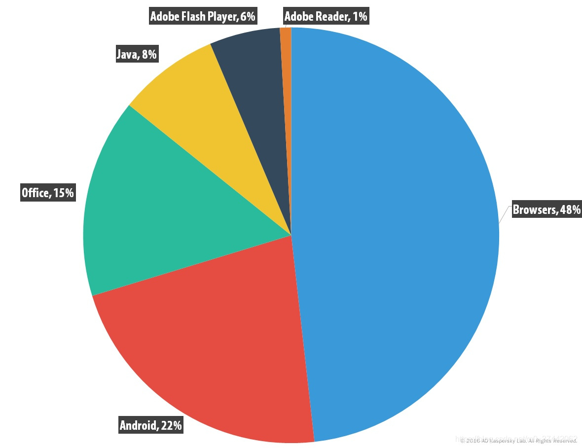 不出所料,我们看到了java的漏洞利用降低3%,Flash漏洞利用增加了1%,而针对Microsoft Office的漏洞利用增加了10%,主要是Microsoft Word的漏洞利用。这些增长是由于携带有包含漏洞的文档的垃圾邮件迅速传播。总体来说,2016年第一季度保持了以前的趋势,网络犯罪分子的注意力主要集中在IE和Adobe Flash Reader上。利用IE我们归类为“浏览器”,一些登录页面能够利用这些漏洞。
