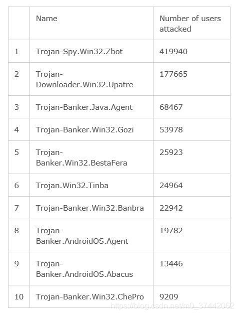 下面的表格中展示了2016年第一季度用于攻击用户在线银行账户最多的木马Top10。