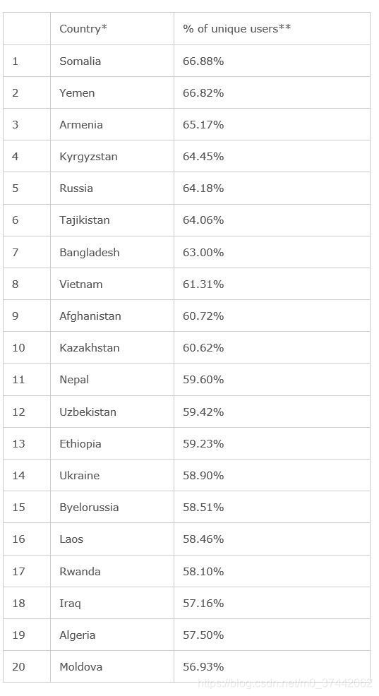 第一季度排行榜第一的是索马里(66.9%)前几个季度的前排国家孟加拉降到了第七(63.6%),新进入排行榜的国家是乌兹别克斯坦(第十二名,59.4%),乌克兰在第十四(58.9%),白俄罗斯第十五(58.9%),伊拉克第十八位(57.2%),摩尔多瓦第二十(57%)。