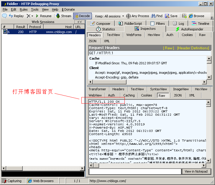 我们用Fiddler 捕捉一个博客园首页的Response然后分析下它的结构, 在Inspectors tab下以Raw的方式可以看到完整的Response的消息, 如下图