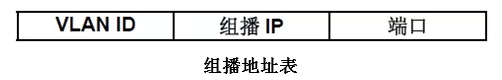 组播地址表:交换机在转发组播数据时是根据组播地址表来进行的。由于组播数据不能跨越VLAN传输,因此组播地址表的第一部分是VLAN ID,当交换机收到组播数据包时,数据包只能在接收端口所在的VLAN内转发。组播地址表对应的出口端口不是一个,而是一组端口列表。转发数据时,交换机根据组播数据的目的组播地址查找组播地址表,如果在组播地址表中查不到相应的条目,则把该组播数据广播,即向接收端口所在VLAN内的所有端口上转发;如果能查找到对应的条目,则目的地址应该是一组端口列表,于是交换机把这个组播数据复制成多份,每份转发到一个端口,从而完成组播数据的交换。组播地址表一般格式如图所示。